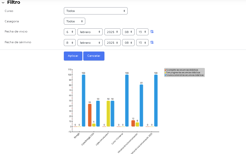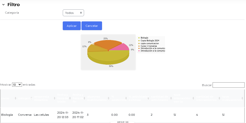 Informe de secuencias didacticas por categoria incluidas las sub categorias, recuento de alumnos matriculados, asistencia y actividades en cada secuencia. |