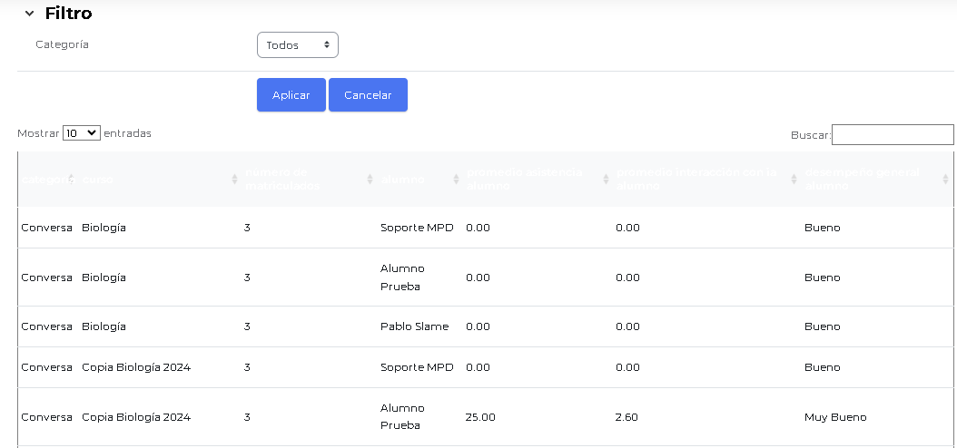 Informe de rendimiento general por cursos y categorias mostrando los alumnos matriculados, cantidad de secuencias didacticas y rendimiento general en el curso |