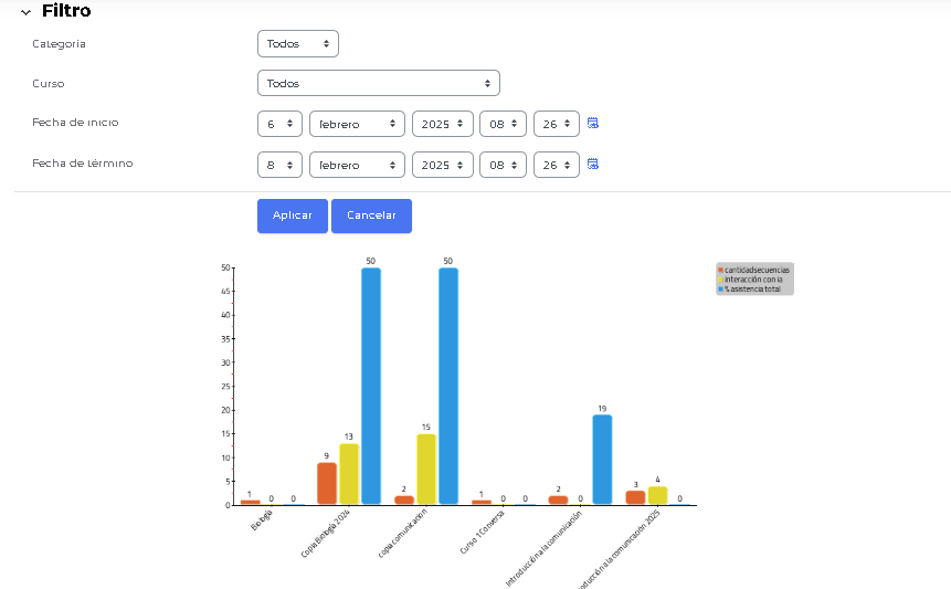 Informe de cantidad de secuencias por curso y categoria mostrando las actividades en el curso, su asistencia, alumnos matriculados y cantidad de interaccion con IA en el curso |
