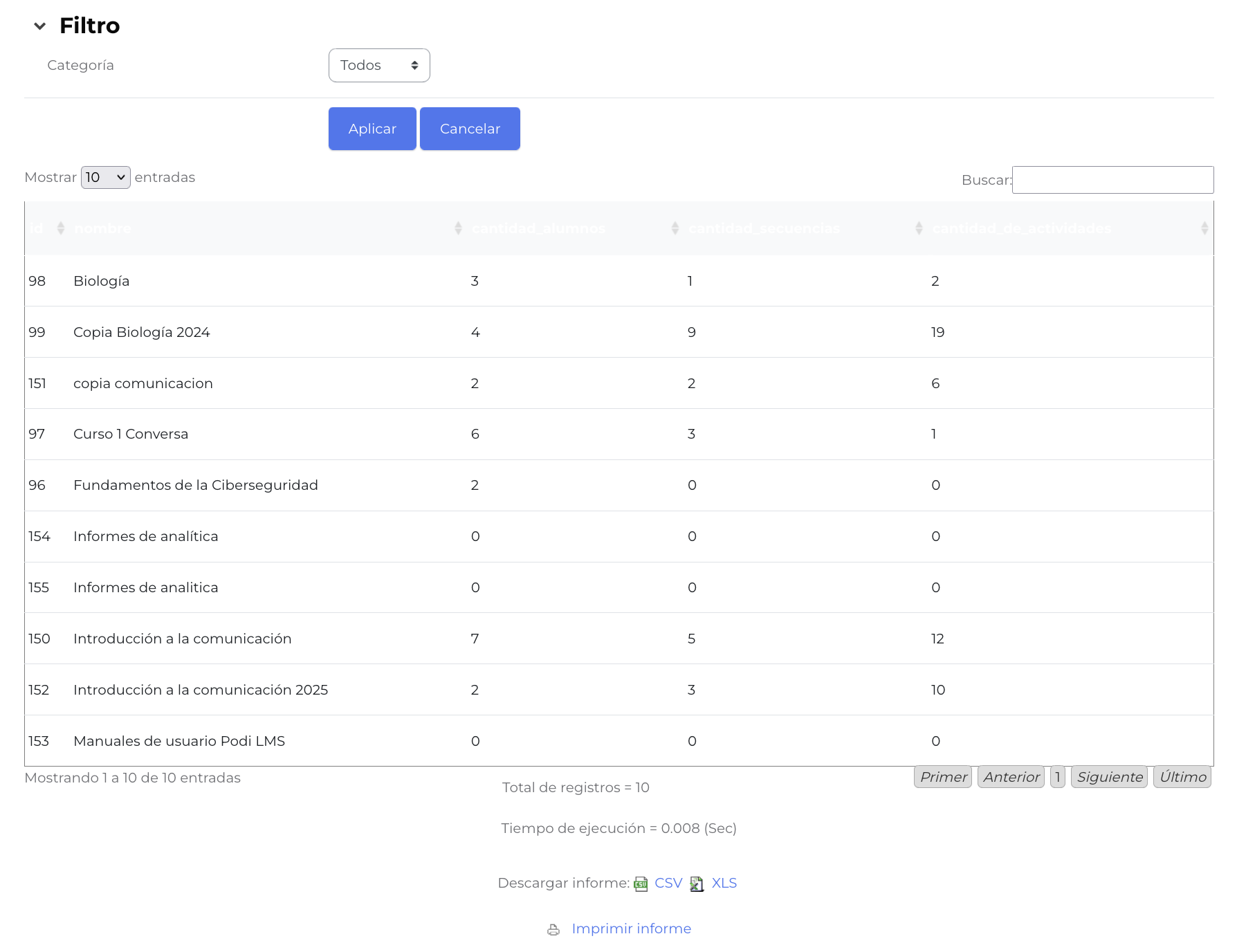 Informe de Cursos por categoria incluidas las sub categorias, recuento de alumnos matriculados, cantidad de secuencias y actividades en cada secuencia. |